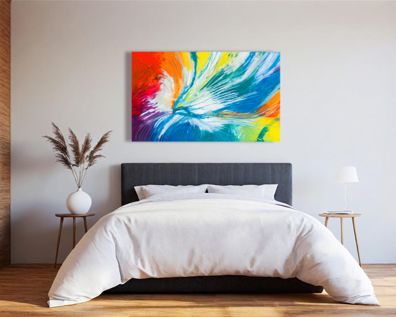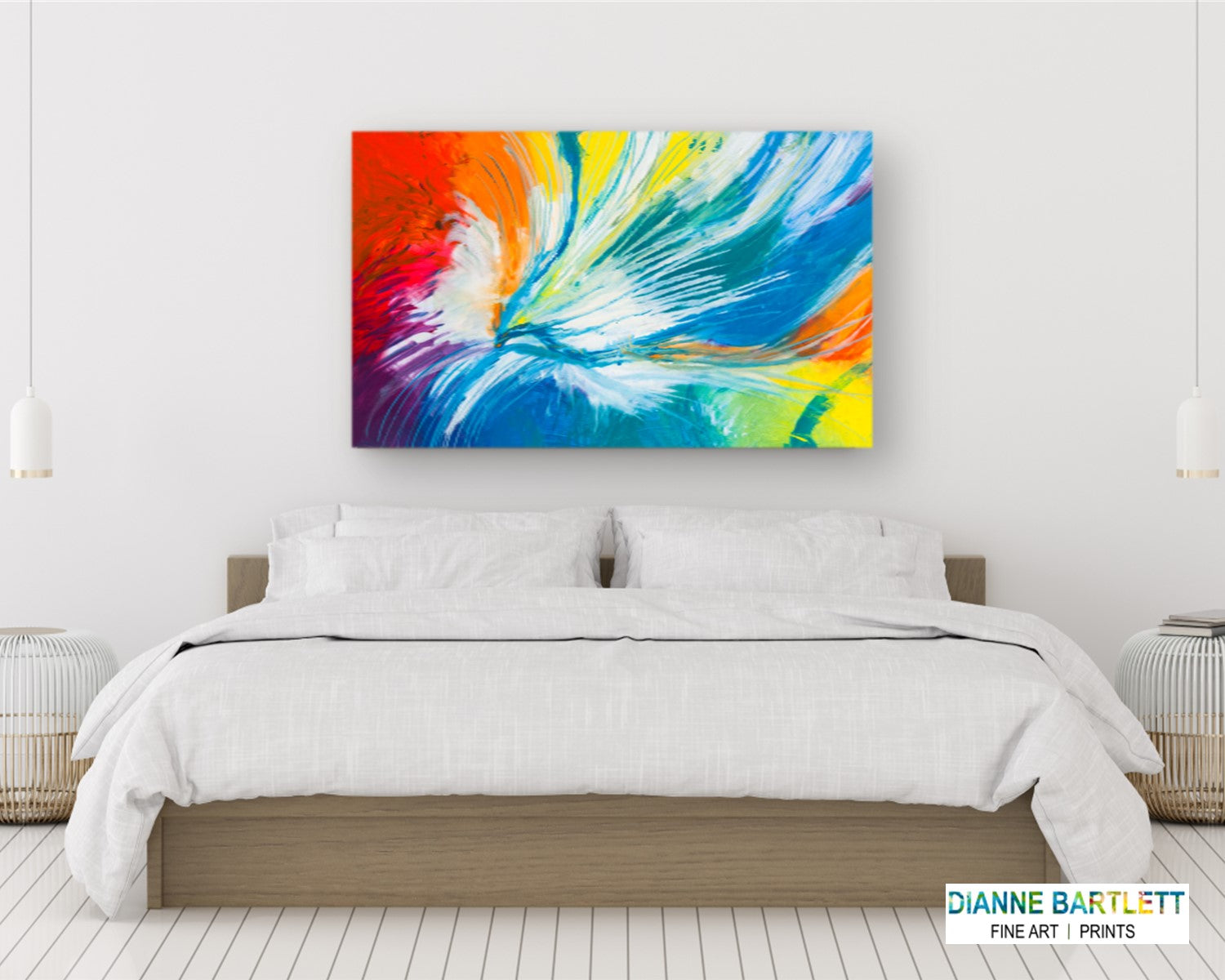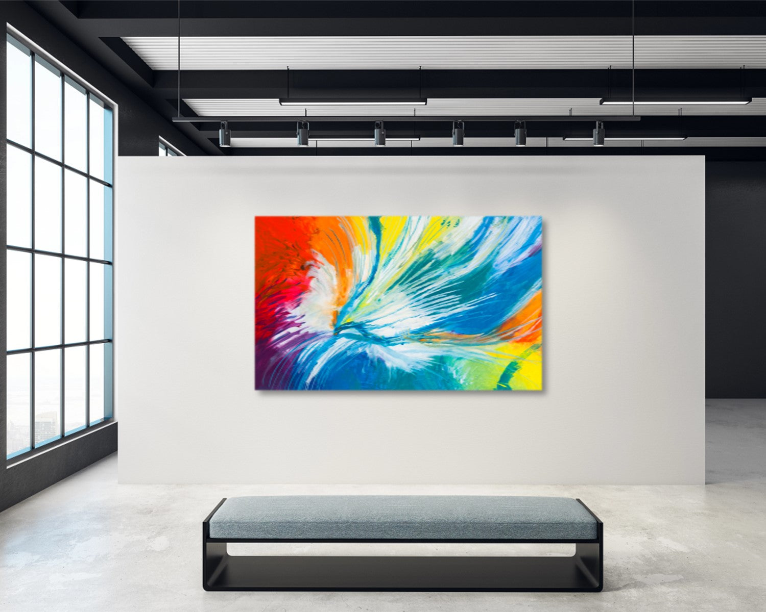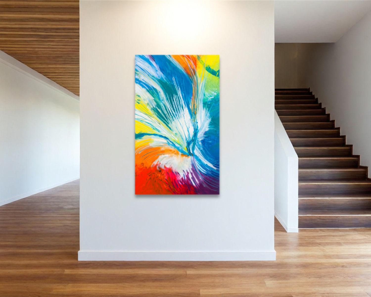 Contemporary abstract painting with unique design and bright colors. Add a conversation piece to your home with original art. Enamel paint on gallery wrap canvas with polyurethane glossy finish.