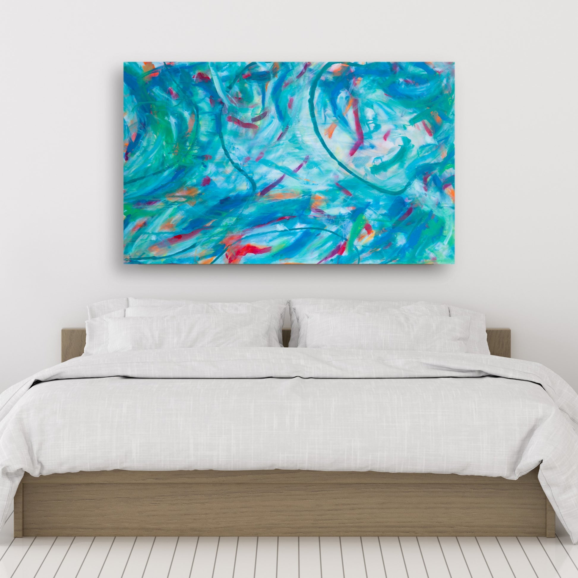 Contemporary abstract painting with unique design and bright colors. Add a conversation piece to your home with original art. Enamel paint on gallery wrap canvas with acrylic finish. Signed on the back so that you may hang it vertically or horizontally.
