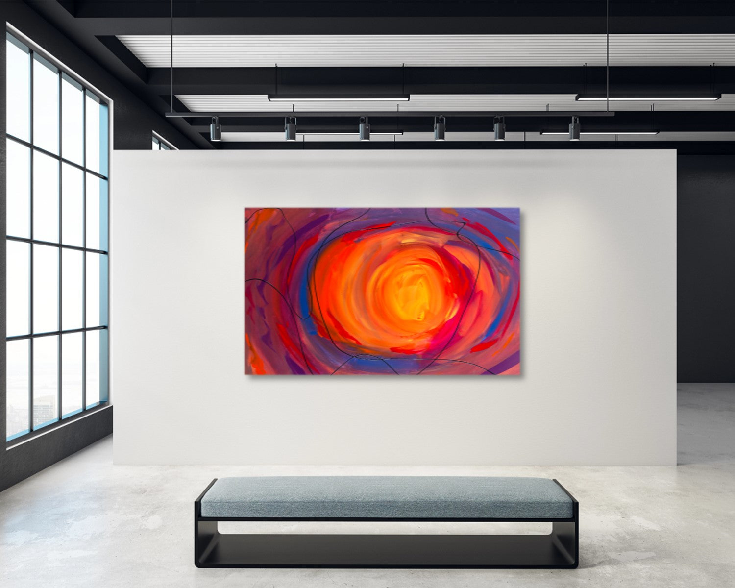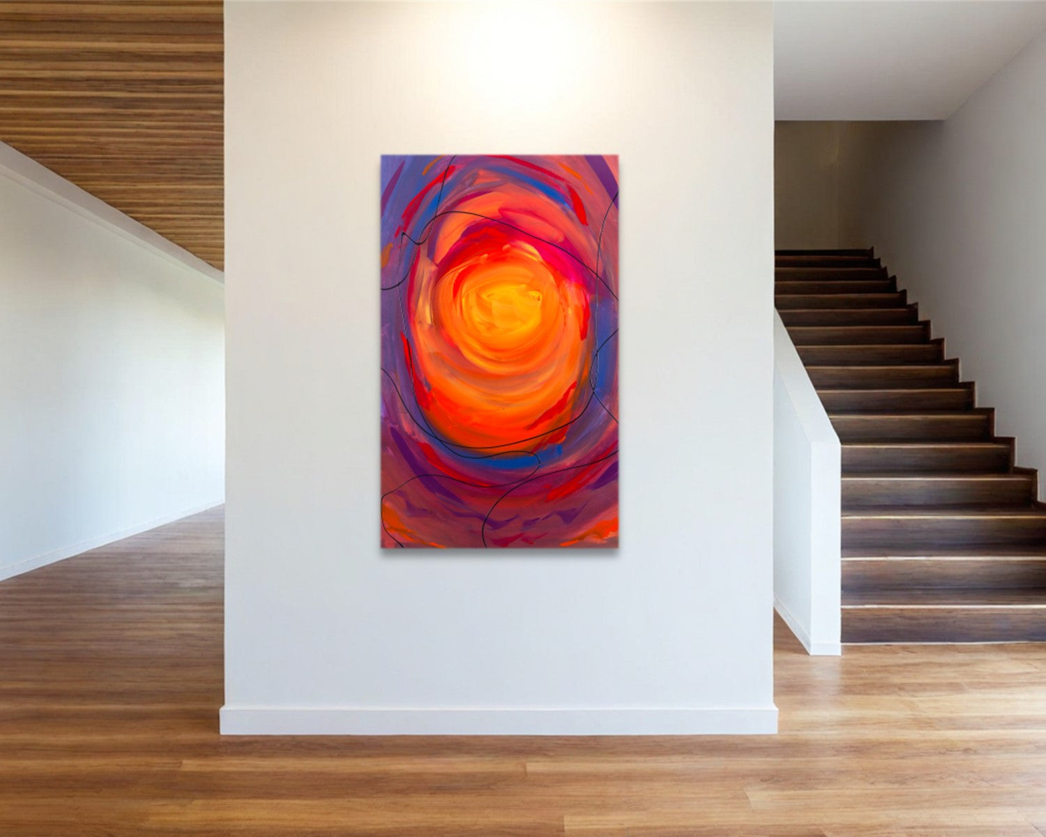 Contemporary abstract painting with unique design and bright colors. Add a conversation piece to your home with original art. Enamel paint on gallery wrap canvas with acrylic finish. Signed on the back so that you may hang it vertically or horizontally.
