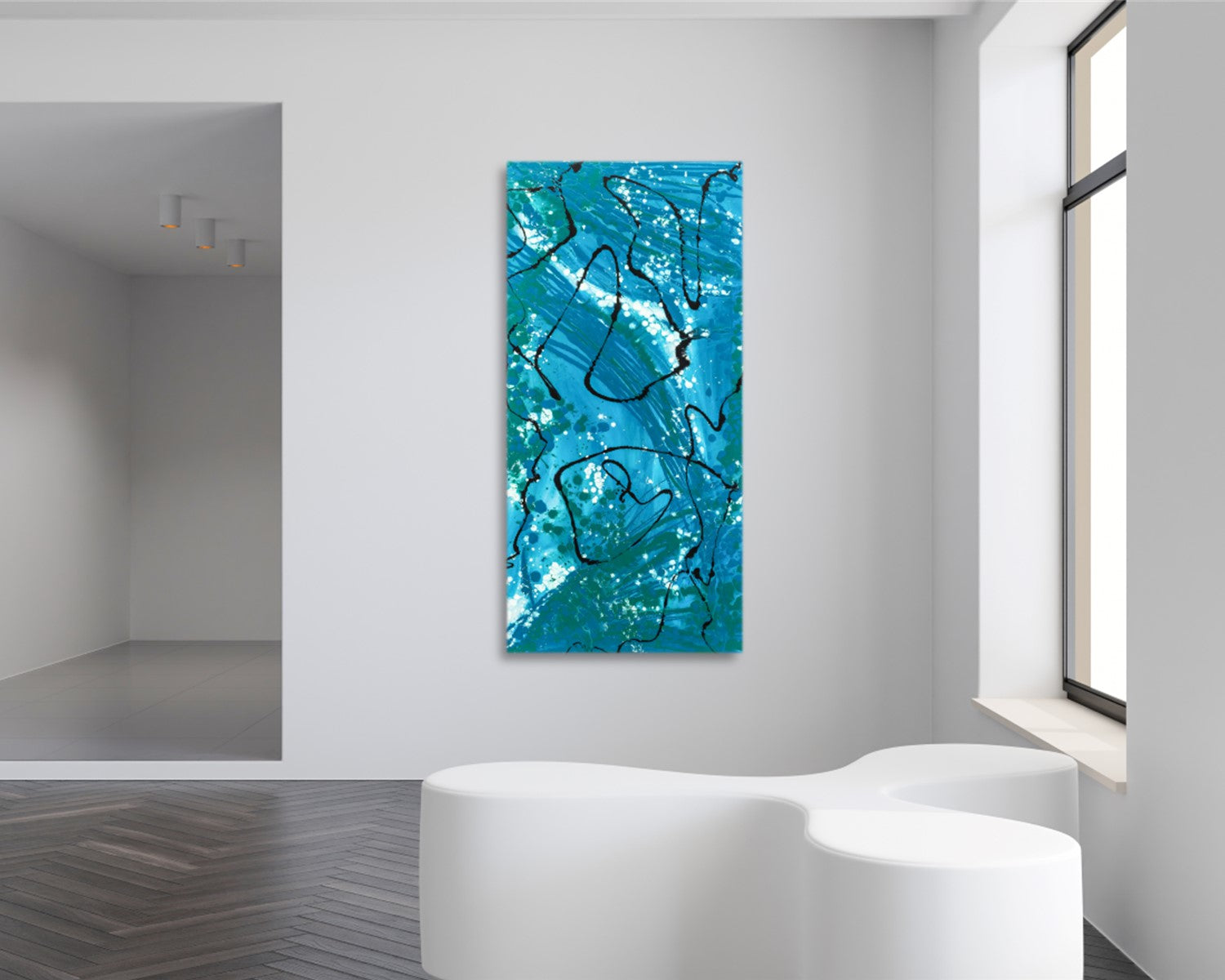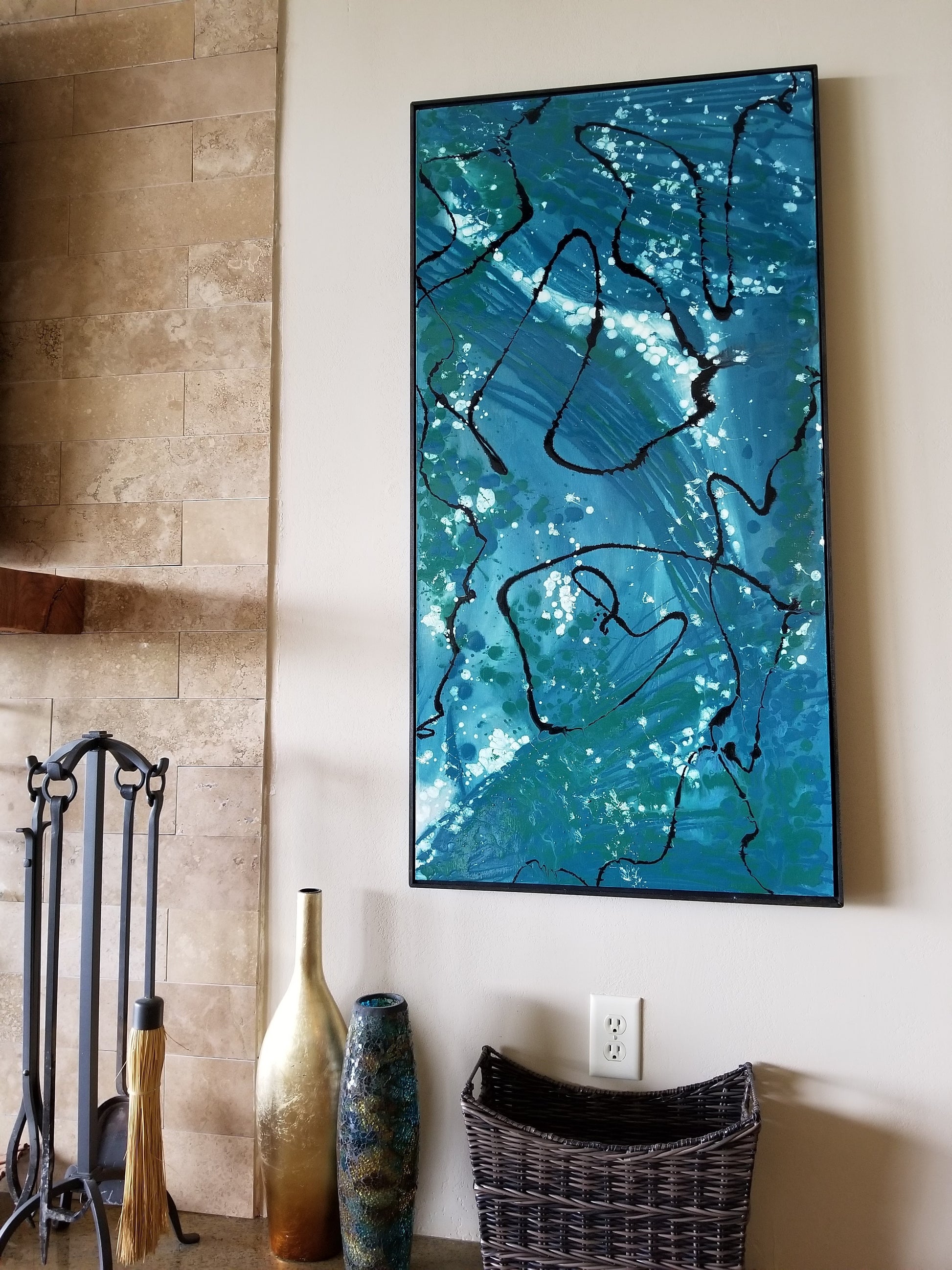 Contemporary abstract painting with unique design and bright colors. Add a conversation piece to your home with original art. Enamel paint on gallery wrap canvas with acrylic finish. Signed on the back so that you may hang it vertically or horizontally.